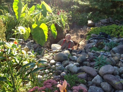 The "water feature" needed an overhaul. With a pond that would not stay full, I suspected that the liner was damaged. Finally I pumped it out and headed to Lowes for a new liner. The bad news: They did not have the 10' x 20' liner I wanted. The good news: Pond liners and pumps were all 20% off and home I came with a 13' x 20' heavier duty liner and stars in my eyes. 5 work days later the pond is larger, a smaller pond feeds the largest by way of a falling cascade and, as of today a third level has been added. Hopefully a couple more days and the liner will be hidden. What fun!
